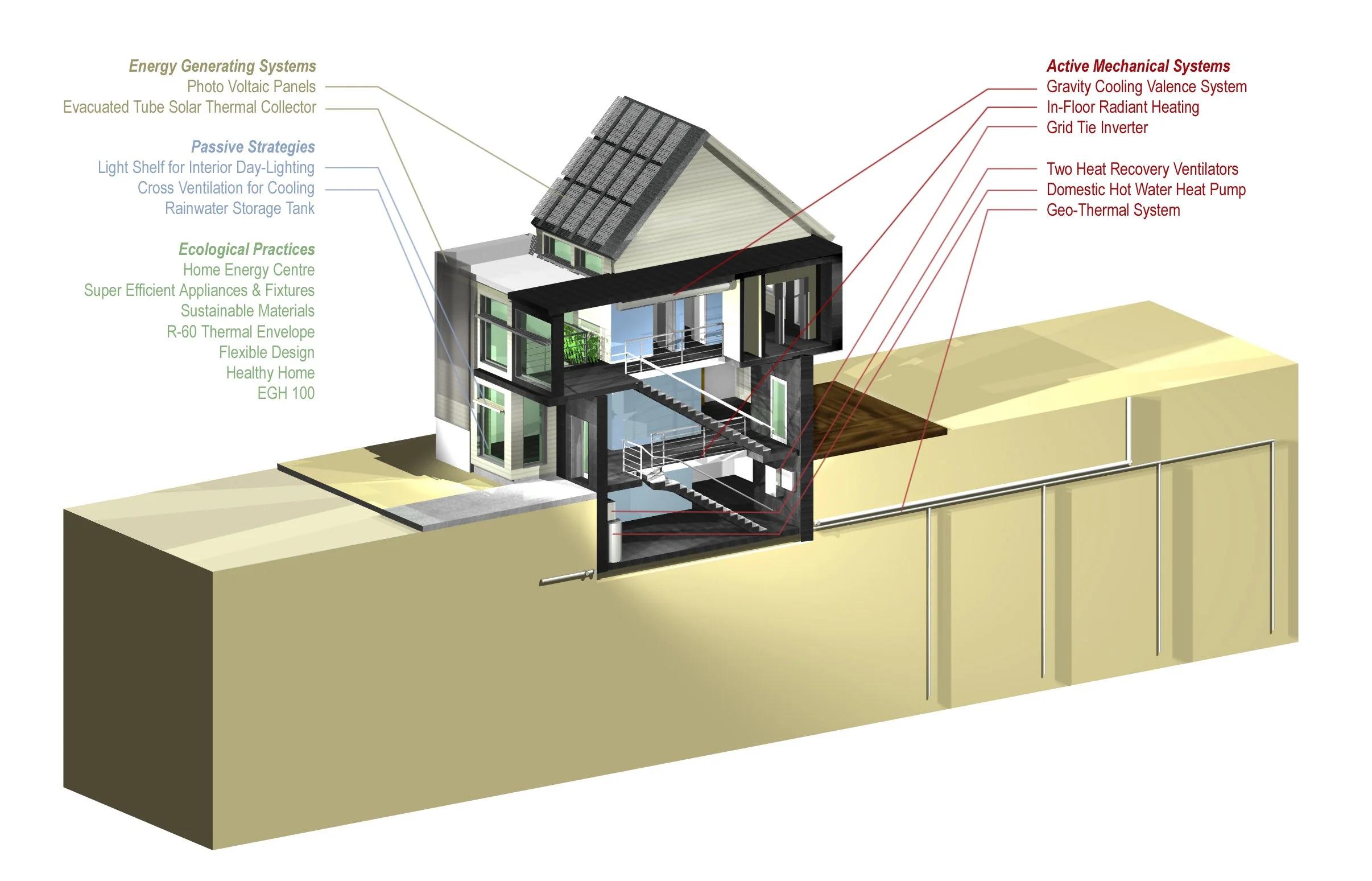 One of twelve winners in the EQuilibrium national competition initiated by Canada Mortgage and Housing Corporation, Net Zero Housing is a zero energy concept house.This concept home was designed as an infill house in an area that has been designated as a Neighbourhood Improvement Zone by the City of Winnipeg. The EQuilibrium initiative will have positive, relevant impacts on the lives of low-income families in Winnipeg; the semi-detached development is borne out of the architect’s commitment to a healthy urban ecology.