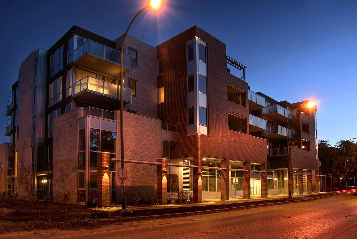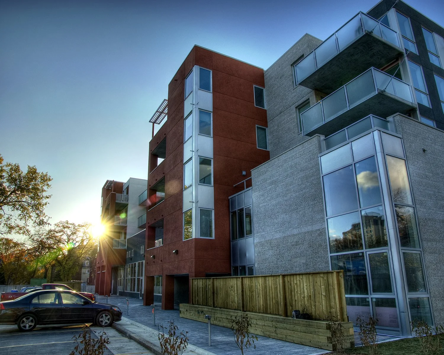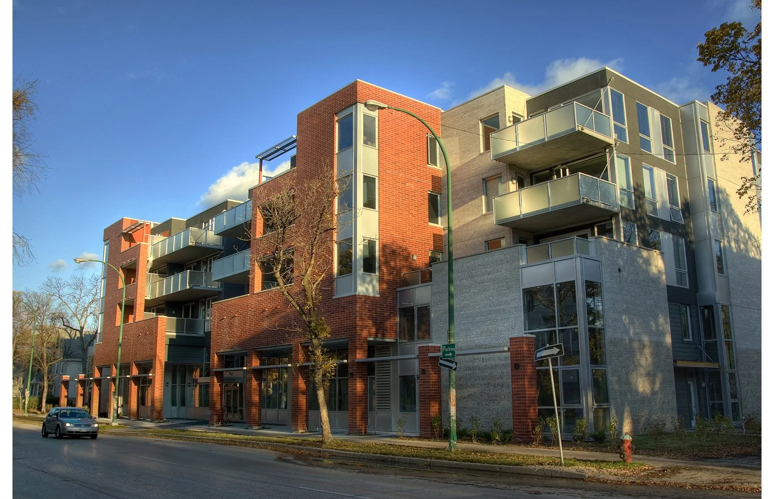 Pulse on River is a Condominium found in the eclectic urban area of Osborne Village. The building is a multi-use facility, with a ground floor level where 10,000 sf of public storefront exists on River Avenue and four condominiums with separate street addresses, both on Bryce Street and Scott Street. In addition to the ground floor residential spaces, the top three stories house 1 and two bedroom condominiums. The project has separate residential entrances from each residential street, where there are six suites per floor. The entire building is services by an underground parking garage that minimizes the need for surface parking in the area.